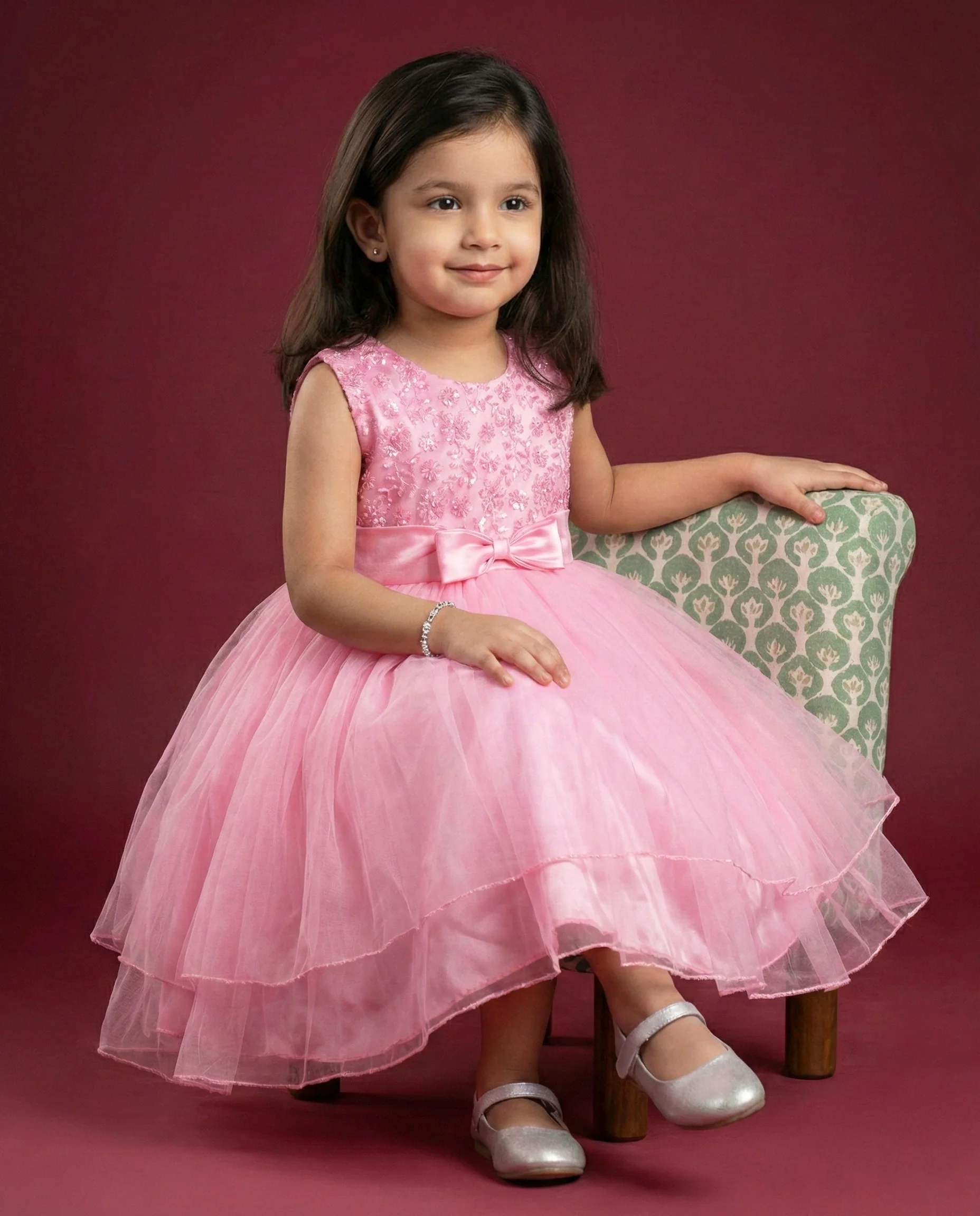 - Fabric: Babypink mono net with premium same colour threadwork detailing on the yoke portion Beautifully designed outfit for Baby girls with smooth lining for comfort. It is non pricky.