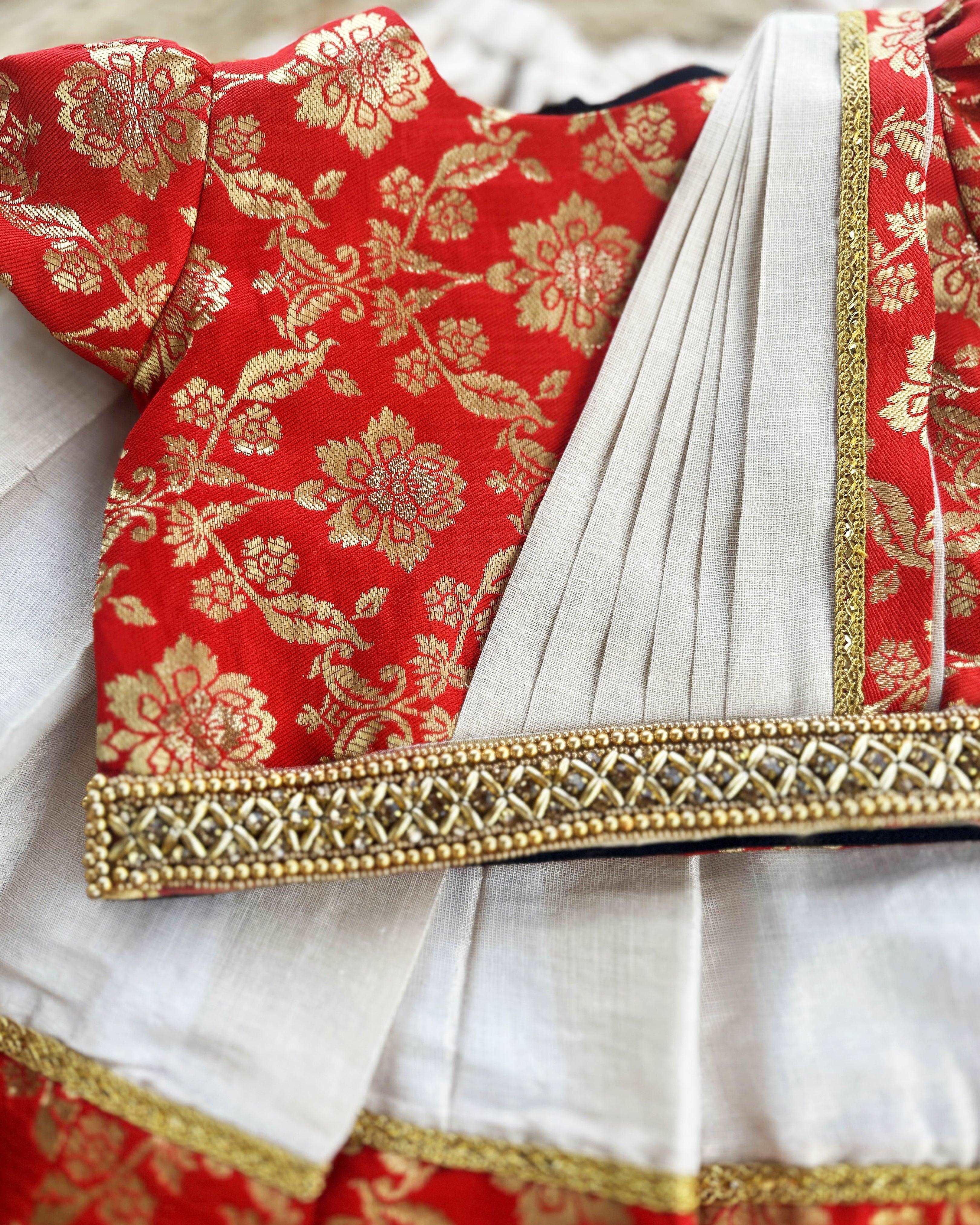 - Material: Copper gold & red jacquard combo semi dhavani type handwork traditional lehenga choli set is made with soft Kerala tissue silk fabric. This combination suggests a rich and contrasting color palette, creating a visually striking and festive look for your little one. The fabric which is used in the blouse is self-golden jari woven jacquard material. The blouse is designed in semi dhavani pattern. Dhavani part is attached in the end portion which is highlighted with golden handwork belt. Golden beads, raindrop beads and white mirror stones are used to make this handwork design. A small puff sleeve is given for a traditional look. The skirt portion is designed with soft silk Kerala tissue fabric. Back portion of the blouse has a long zipper for easier opening and closing. The inner portion is covered with high quality soft poplin cotton lining.