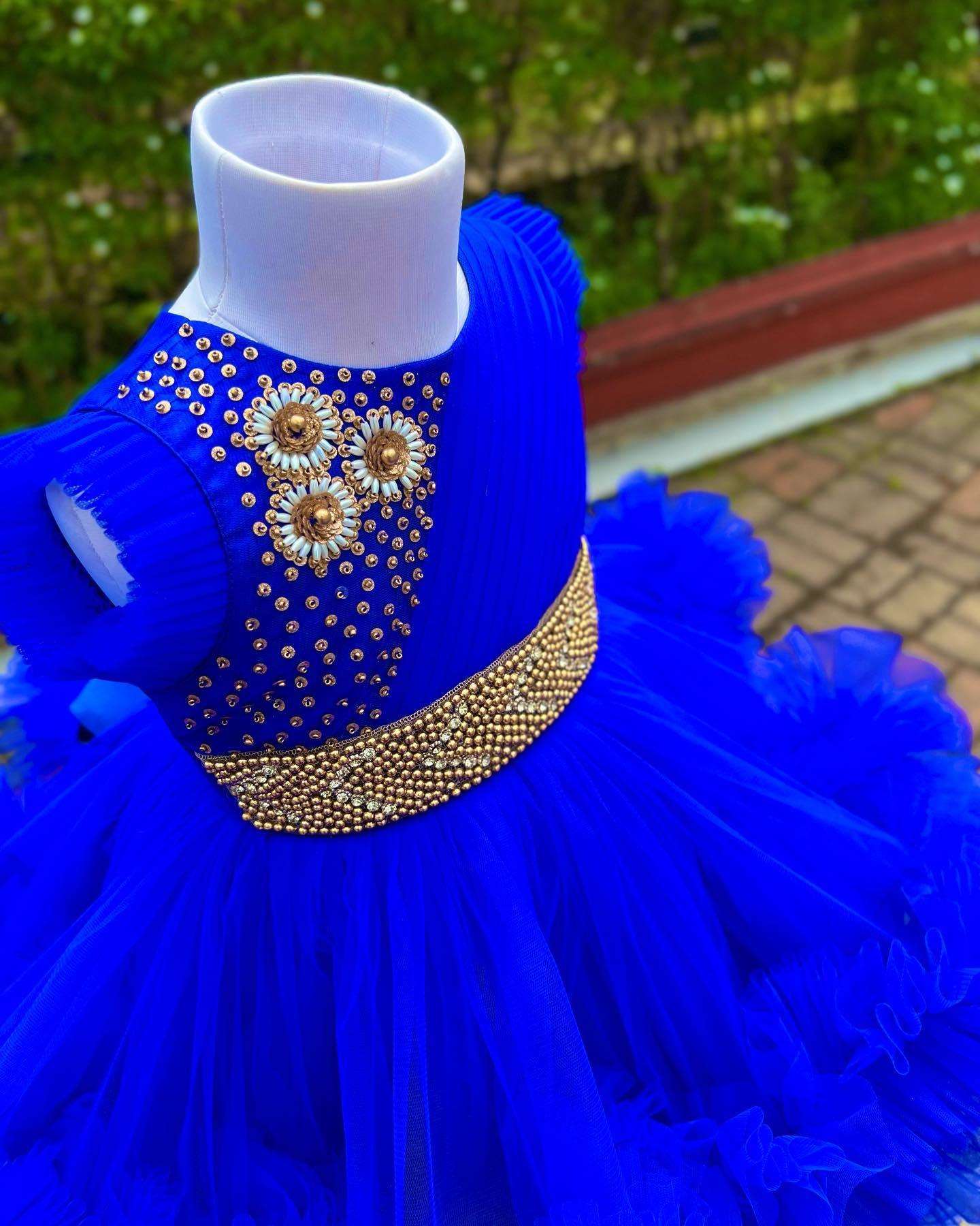 -70%Royalblue Layered Pleated Heavy Ruffled Hand embroidery Birthday Frock—
